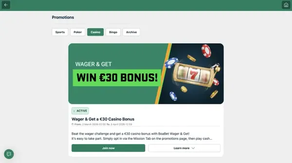 Vi publiserer tilbudene våre med tydelige inngangspunkter og grunnleggende vilkår, slik at du ser hva som kreves før du velger å delta. De fleste kampanjer er knyttet til kasinospill, men vi kjører også sportsfordeler og boosts på flerspill. Når du aktiverer en Boabet bonus, kan du følge fremdriften i kontoen din og sjekke gjenværende omsetningskrav.
